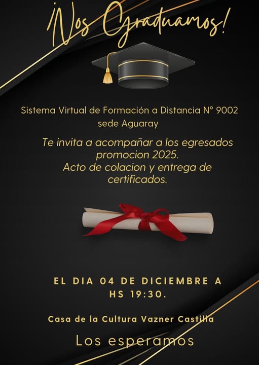 La Municipalidad de Aguaray conjuntamente con el plantel docente del Sistema Virtual de Formación a Distancia N° 9002- Sede Aguaray. Tienen el agrado de invitar a la comunidad al Acto de Colación correspondiente al ciclo lectivo 2025.