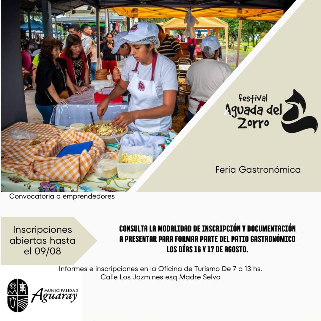 Se informa a los interesados en participar en los stands de ventas durante el Festival Aguada del Zorro, deben pasar por la Oficina de Turismo Municipal de 7:00 a 13:00 Hs por requisitos e información para el registro de inscripciones. Modalidad de registros de stand: