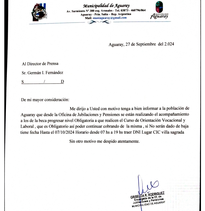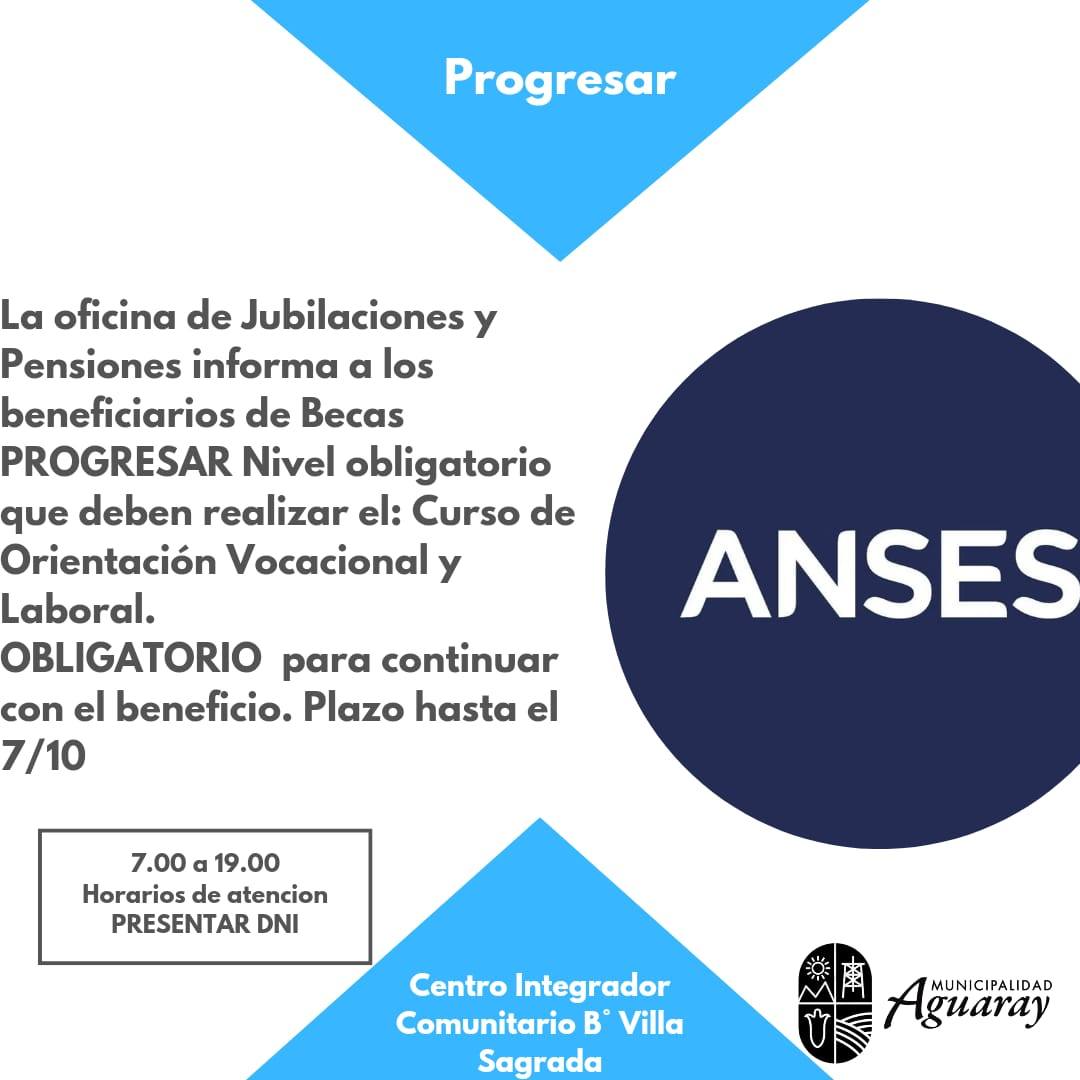 La Oficina de Jubilaciones y Pensiones informa a todos los beneficiarios de la Beca Progresar – Nivel Obligatorio que, para continuar percibiendo el beneficio, es necesario realizar el curso de “Orientación Vocacional y Laboral” correspondiente. Este curso es un requisito fundamental para mantener la beca activa.