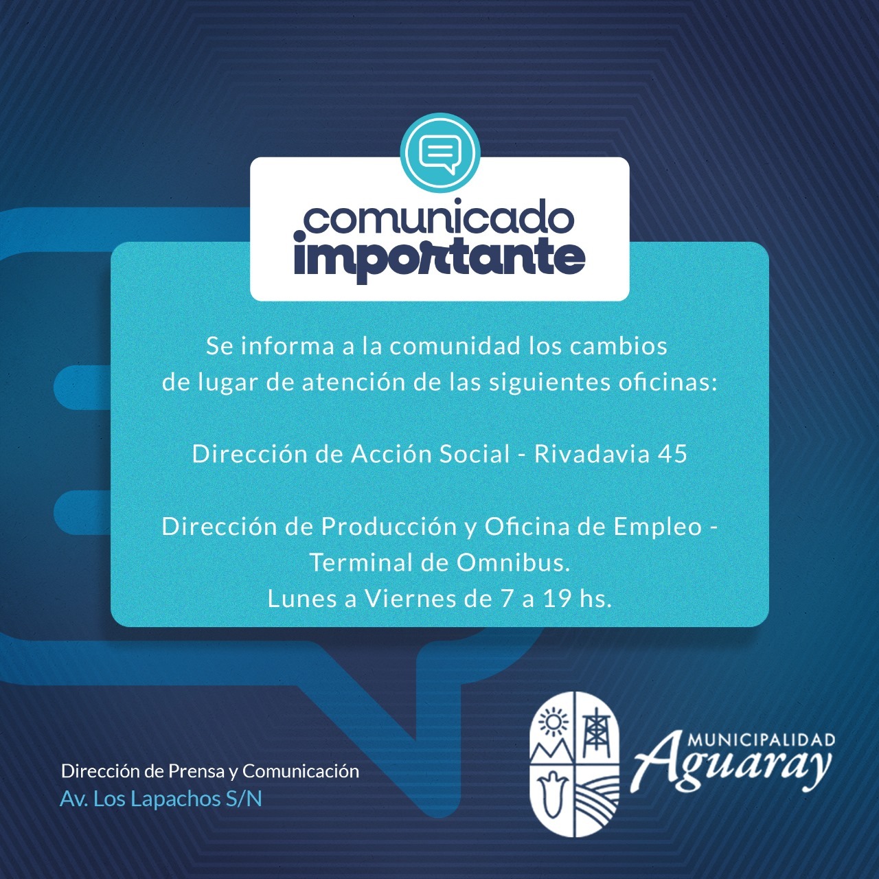 Se informa a la comunidad en general, que la Dirección de Acción Social y la Dirección de Producción están funcionando en sus nuevas direcciones, a fin de mejorar la eficiencia de nuestros servicios y proporcionarles una mejor atención.