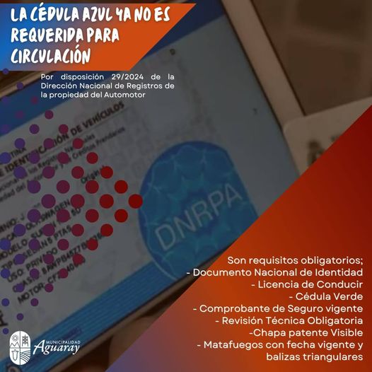 La Dirección de Tránsito Municipal, informa a la población que, tras la derogación de la cédula azul, está ya no será exigible para la circulación de vehículos en el país, la cédula verde no tendrá fecha de vencimiento, según la Disposición 29/2024 de la DNRPA publicada en el Boletín Oficial. La cédula verde original se emitirá en diversos trámites y en formato físico y digital, accesible a través de la aplicación “Mi Argentina”