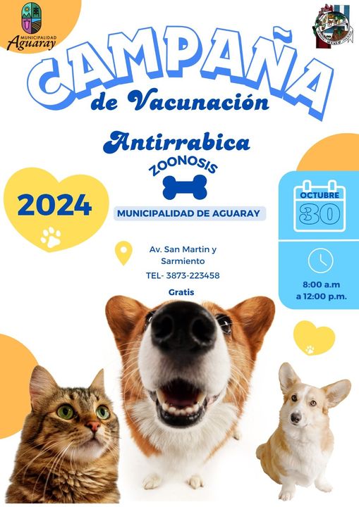 La Dirección de Zoonosis informa a la comunidad que la campaña de vacunación antirrábica gratuita para perros y gatos se desarrolla en la oficina ubicada en Av. San Martín de 8:00 a 12:00 Hs. Invitamos a todos los vecinos a realizar la aplicación de vacuna para el bienestar de nuestros animales y la comunidad en general.