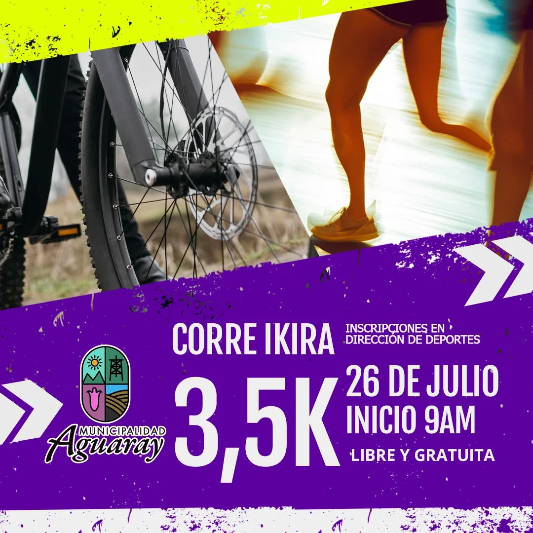 En el marco de las festividades patronales de la comunidad de Ikira, la Dirección de Deportes te invita a participar de la carrera pedestre y ciclista “Corre Ikira”, una propuesta para disfrutar al aire libre este sábado 26 de julio. La actividad es libre y gratuita, con recorridos de 3,5 km, pensados para que todos puedan sumarse.
