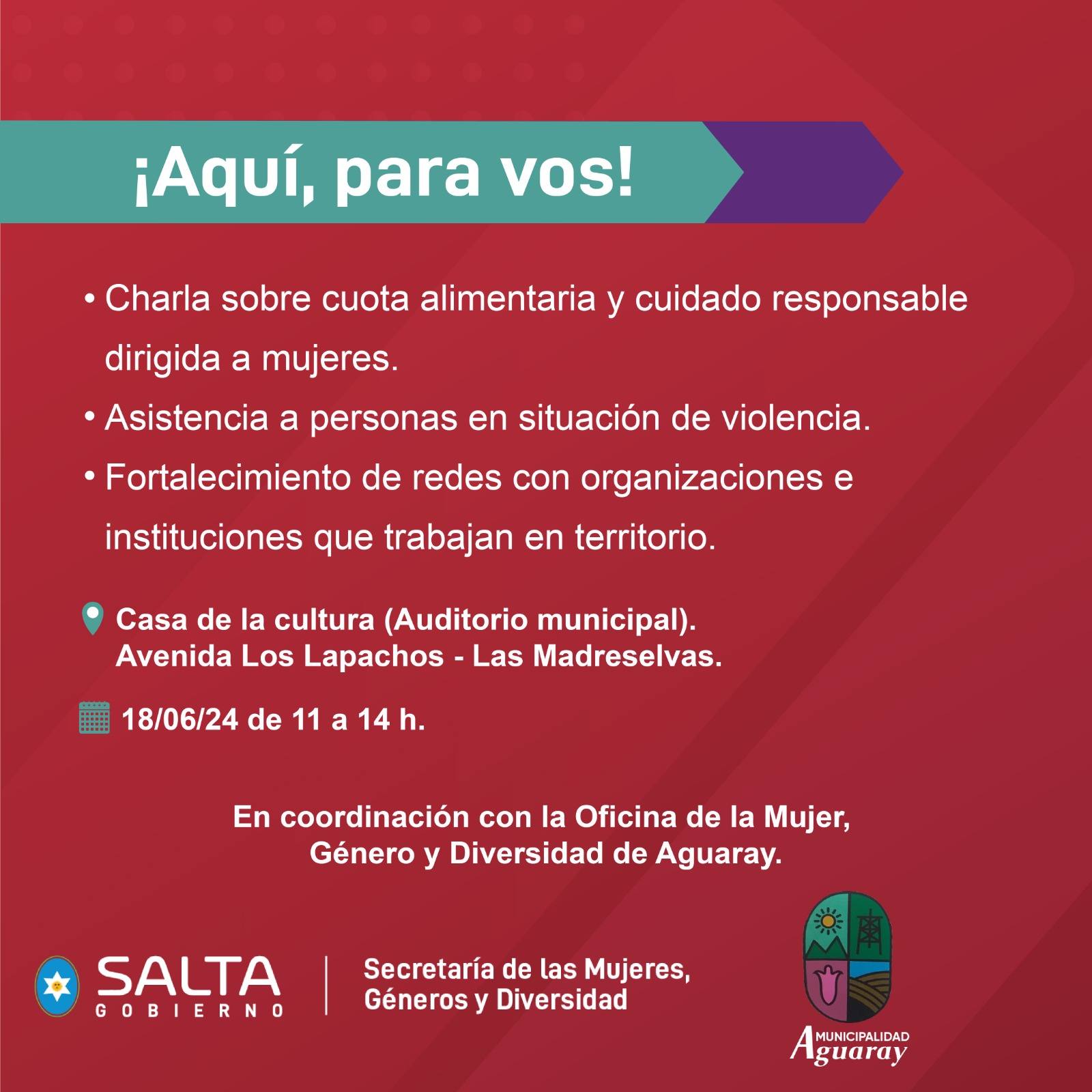 La Oficina de la Mujer, Genero y Diversidad en coordinación con la Secretaria de la Mujeres de Salta, invitan a participar de una charla informativa destinada a abordar temas fundamentales para el bienestar de las personas en situación de violencia. Temas a tratar: