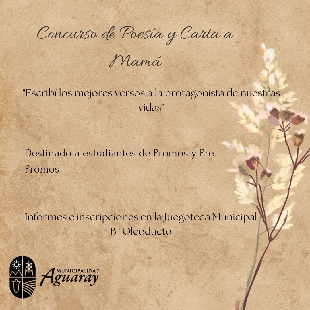 Invitamos a los estudiantes de promociones y pre-promociones de los distintos establecimientos educativos secundarios a participar del “Concurso de Poesía y Carta a Mamá” en el marco del Día de la Madre. Este concurso tiene como objetivo fomentar la creatividad y expresión de sentimientos a través de la escritura en los jóvenes, el jurado estará integrado por escritores locales. Tenes tiempo hasta el 18 de octubre.