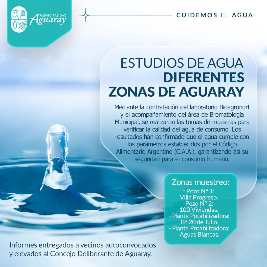 Los análisis arrojaron como resultado que la misma es apta para consumo humano cumpliendo los parámetros del Código Alimentario Argentino (C.A.A.). Dicho informe fue elevado tanto a los miembros del Concejo Deliberante como a los vecinos Autoconvocados de Aguaray.