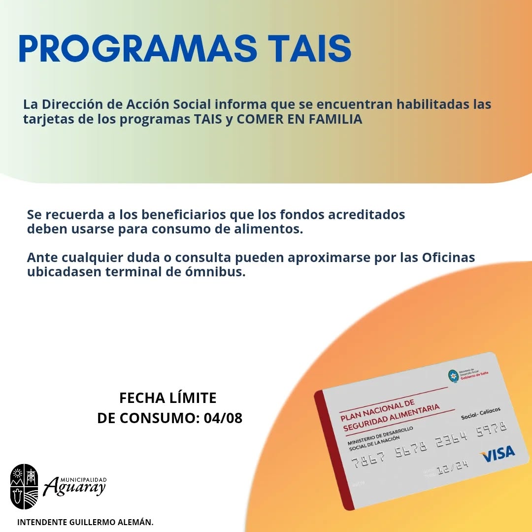 Se informa a la comunidad adherida al programa TAIS y COMER EN FAMILIA que las tarjetas se habilitaran con el importe correspondiente hasta el 04/08/2025. Ambas son de uso exclusivo de productos alimenticios, es importante recalcar que el monto no es acumulable por lo tanto deben consumir el total acreditado.