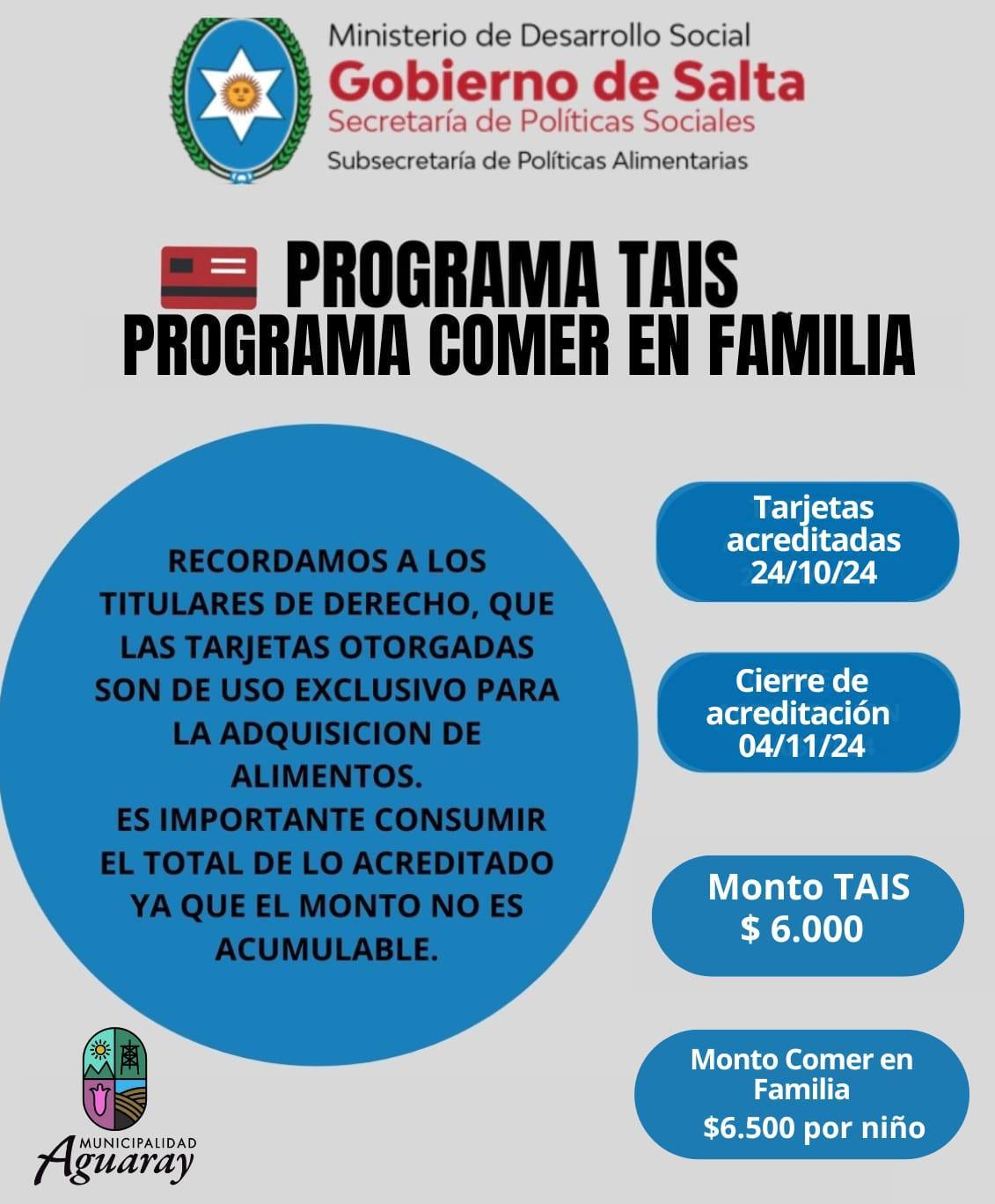 Se comunica a los beneficiarios del programa TAIS y COMER EN FAMILIA, que el día de hoy jueves 24/10 después del mediodía se acreditaran los montos de las tarjetas de ambos programas correspondientes al mes de Octubre/24.