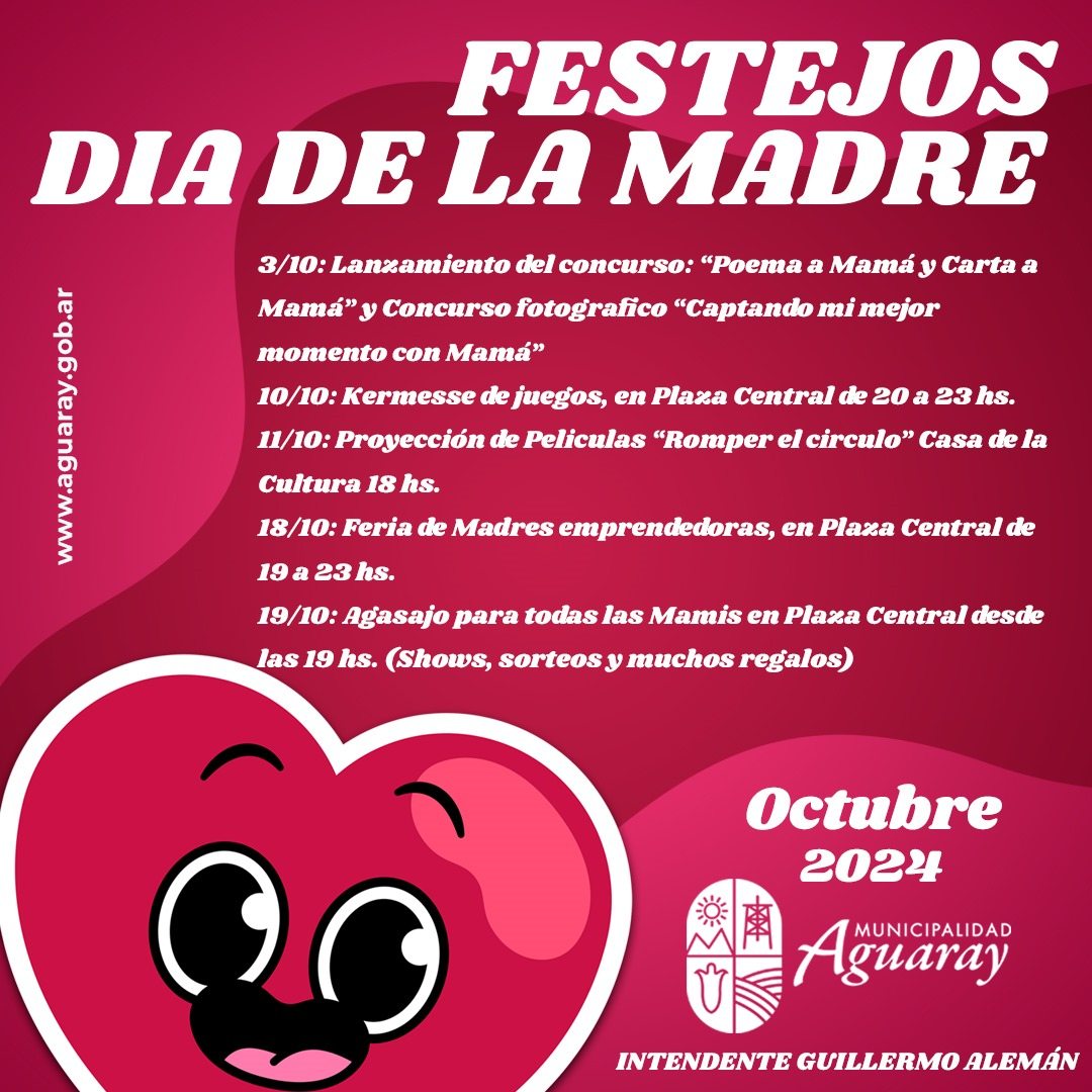 La Municipalidad de Aguaray a través de la Dirección de Niñez, Familia y Discapacidad inicia las actividades programadas en el marco de los festejos del Día de la Madre. A partir de mañana jueves 3 de octubre, inician las diversas propuestas recreativas y culturales para honrar a todas las madres de nuestra comunidad.