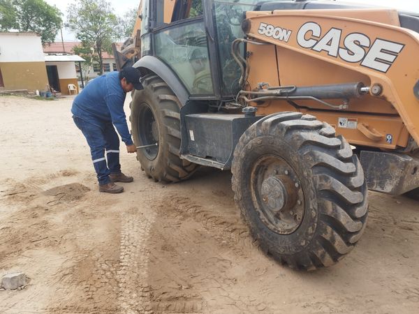 Personal municipal, realiza el mantenimiento y recambio de los neumáticos de la retroexcavadora municipal, con el objetivo de asegurar el correcto funcionamiento de esta importante maquinaria en las tareas diarias de obras y servicios públicos.