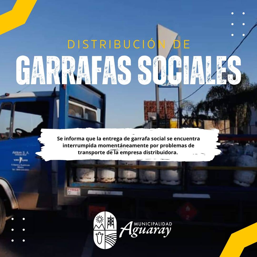 Se comunica a los beneficiarios del programa Garrafa Social, que la entrega de las mismas se encuentra momentáneamente interrumpida por problemas de transporte de la empresa distribuidora. Ante cualquier novedad se informará a través de las redes sociales oficiales de la Municipalidad de Aguaray.