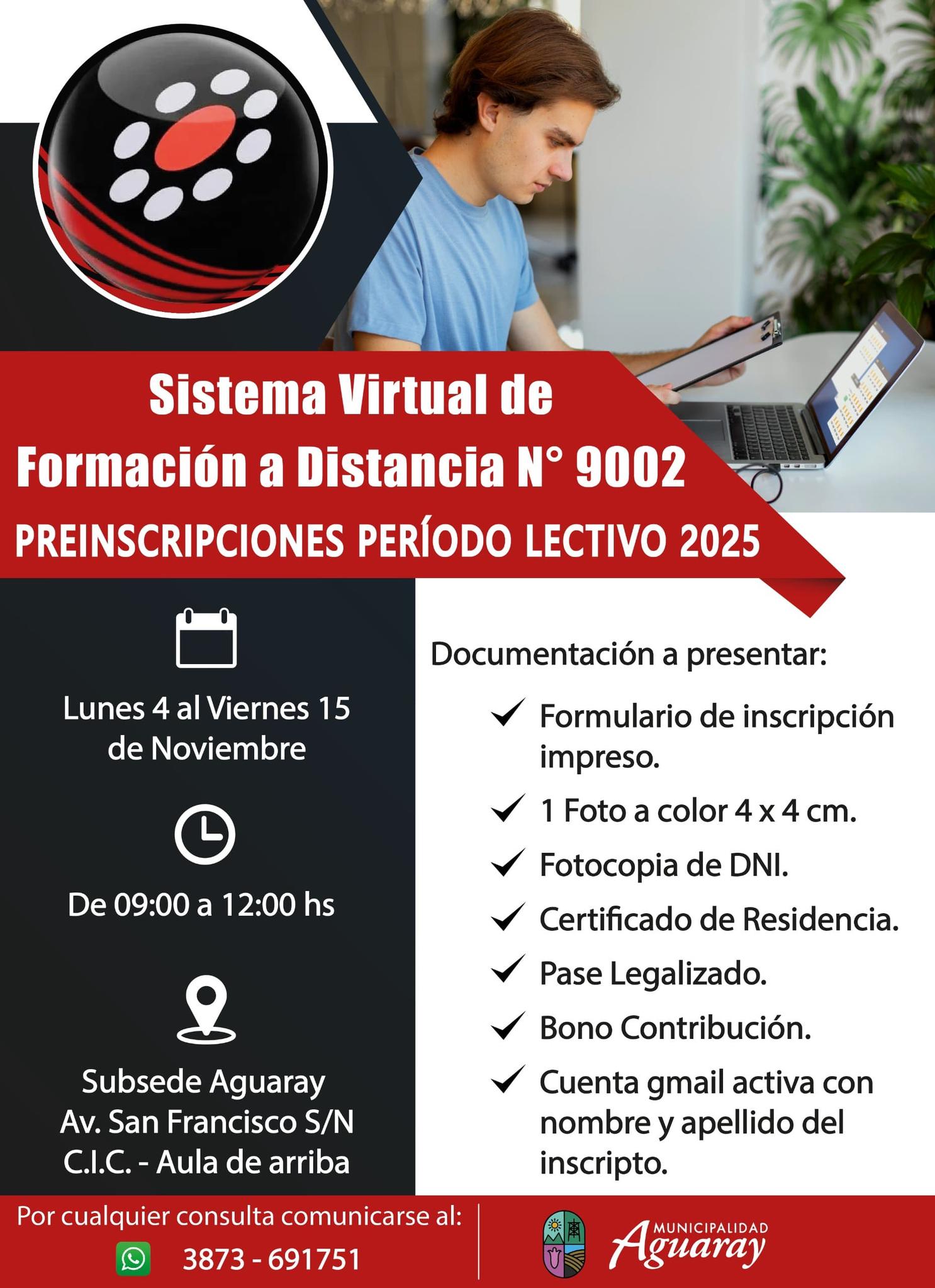 Se informa que desde el 4 al 15 de noviembre podrán inscribirse al sistema virtual de Formación a Distancia para finalizar los estudios secundarios en el ciclo lectivo 2025. Los interesados deben acercarse al C.I.C de Lunes a Viernes de 09:00 a 15:00 hs.